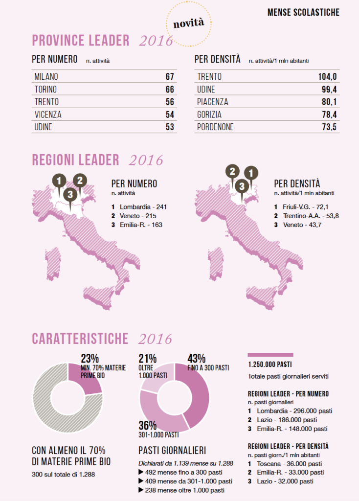 Vorrei fare emergere, stando al rapporto Bio Bank 2017, la crescita del +12% delle mense, che da 1.116 del 2011 sono passate a 1.250 del 2015 e a 1288 nel 2016; quindi si conferma la crescita. Le regioni leader per numero sono la Lombardia con 241 attività, Veneto con 215 ed Emilia Romagna con 163. Per densità invece abbiamo il Friuli in testa con 72,1, il Trentino con 53,8 ed il Veneto con 43,7. Al nord il numero è decisamente più alto rispetto al resto delle altre regioni, ciò significa che un aumento è visibile, ma molto ancora c’è da fare e le opportunità ci sono sicuramente. Una domanda però vorrei farmela e farvela, come mai c’è sempre il nord in pole position? Cosa manca alle altre regioni. E’ un problema di cultura? Di informazione? Di paura di cambiare? Burocrazia? Cosa?