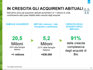 Questa non è una novità per noi, in quanto ne abbiamo parlato moltissime volte sui miei profili. È stata l’ennesima conferma del fatto che il cliente che consumava il prodotto bio non è più lo stesso, come ho già detto più volte. Il prodotto biologico era considerato di nicchia e come tale veniva acquistato solo dalle persone con una cultura al consumo del prodotto biologico, persone generalmente con una cultura medio alta e con un potere economico superiore alla media.  Adesso, al contrario, l’acquisto dei prodotti bio da parte degli acquirenti abituali aumenta, i prodotti vengono acquistati da molte più persone con un potere d’acquisto inferiore. Questo cambiamento è dovuto anche all’effetto delle campagne ministeriali e non solo, in cui si dimostra che il prodotto bio è un prodotto sano, che fa bene alla salute e, giustamente, deve poter essere consumato da tutti e non soltanto da un élite. Dalla slide sottostante si evince di quanto aumentano gli acquirenti abituali nel settore del biologico nell’ultimo anno.